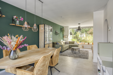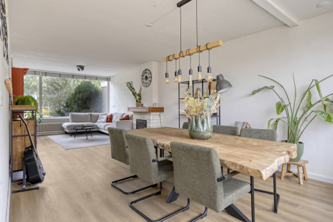 De woonkamer is tuingericht en biedt voldoende ruimte voor een grote zithoek met tv. Tussen het zitgedeelte en de keuken kun je met gemak een royale eettafel kwijt, ideaal voor gezellige diners of spelletjesavonden. Vanuit de woonkamer stap je direct en altijd droog naar buiten onder de royale overkapping — een fijne verlenging van je leefruimte, waar je in elk seizoen kunt genieten van het buiten zijn.