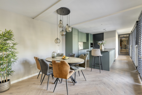 De keuken ligt aan de voorzijde van de woning en heeft een brede raampartij, zodat je tijdens het koken leuk contact houdt met wat er buiten gebeurt. De hoekopstelling biedt volop bergruimte in de hoge apothekerskast, lades en bovenkastjes. Qua apparatuur is alles aanwezig en in 2025 vernieuwd: een vaatwasser, een nieuwe combi-oven/magnetron, een extra brede inductiekookplaat met vijf kookzones, een koelkast en een vriezer.